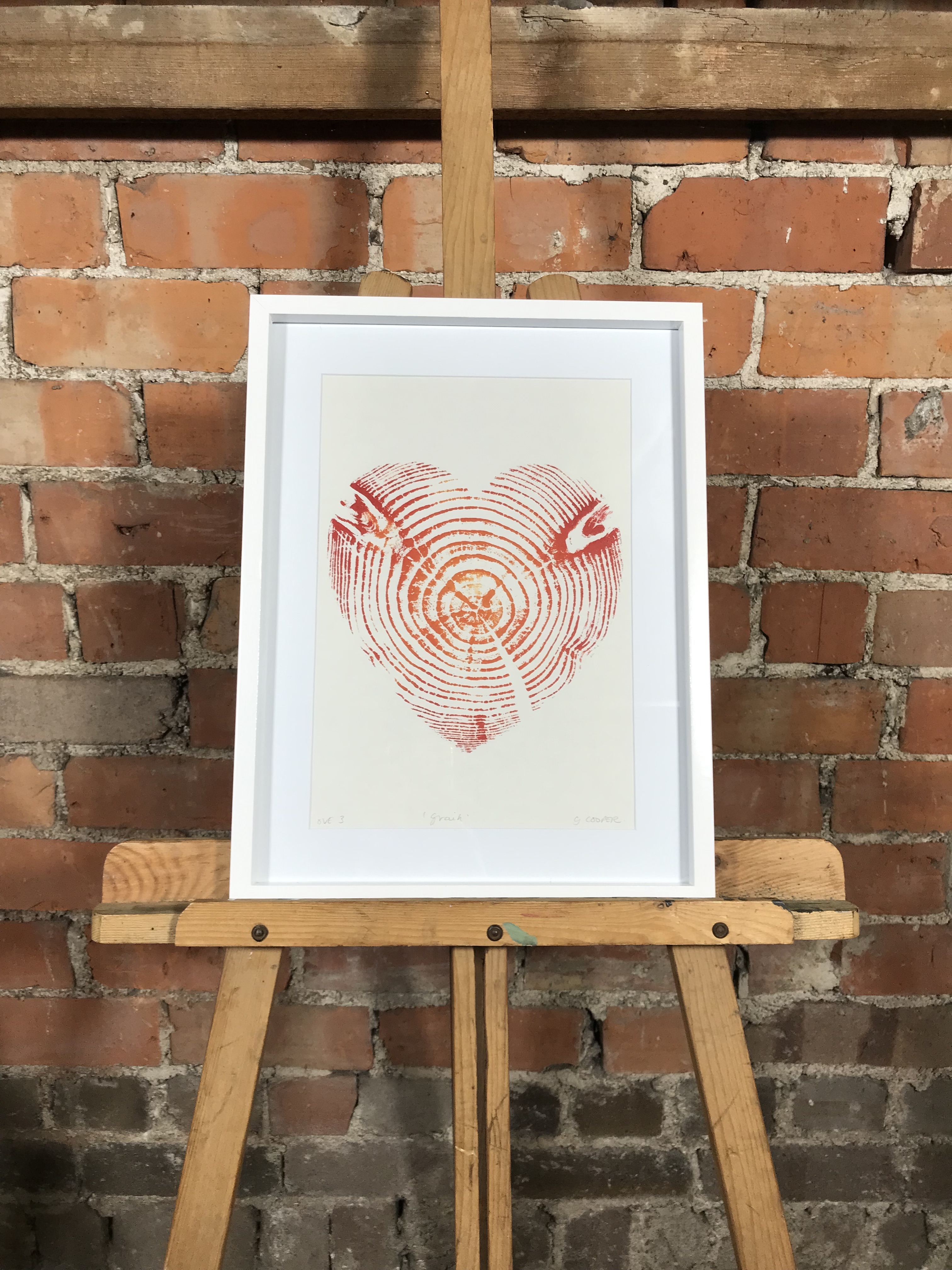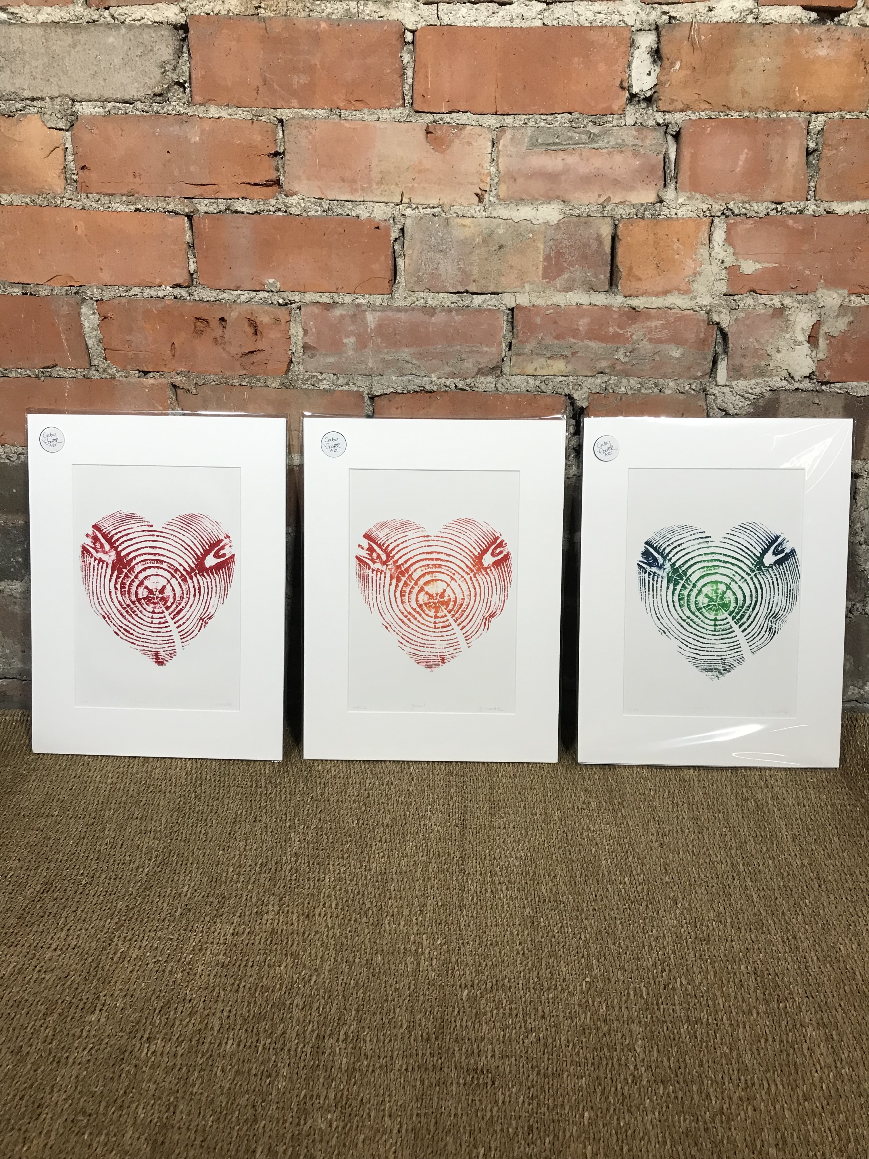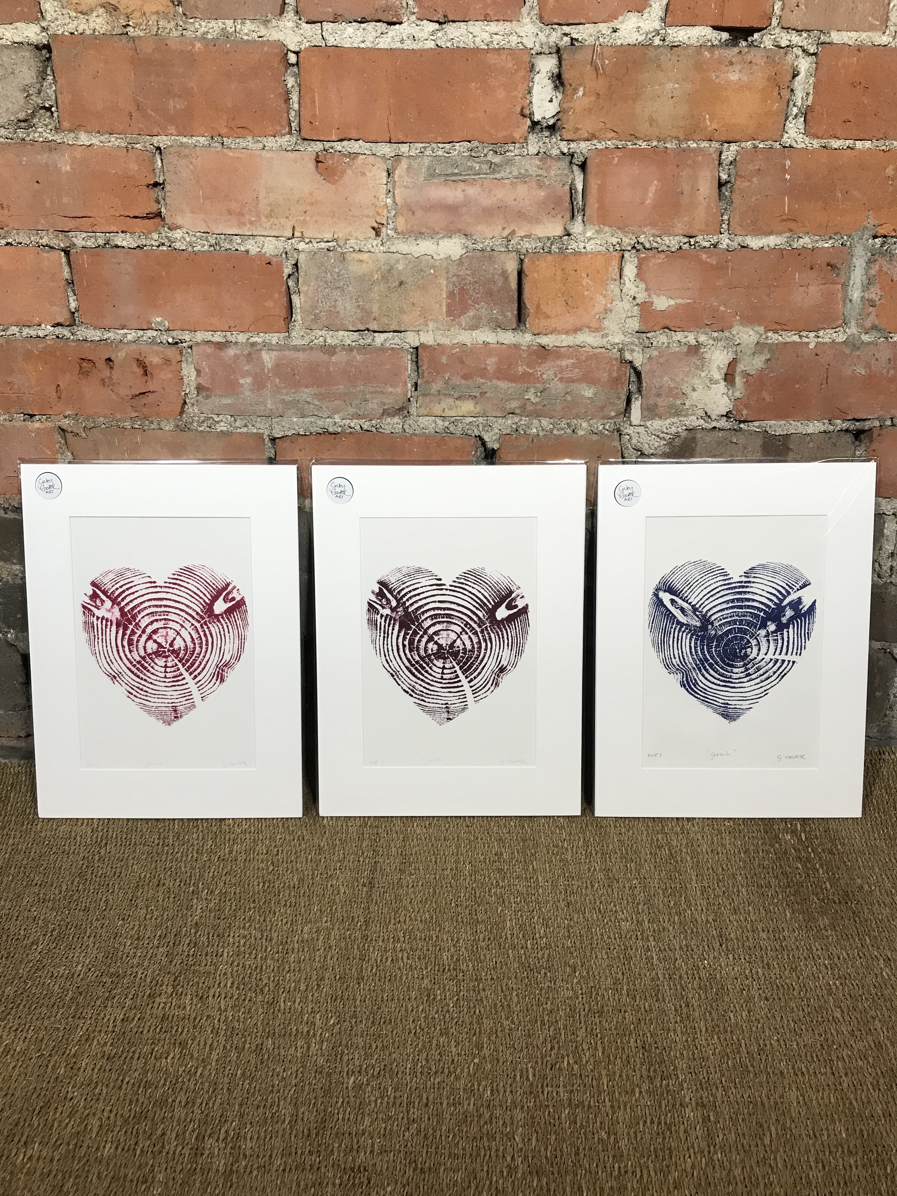 Love heart trio - 'graih' meaning 'love' in Manx, shown in red, oranges, and greens/blues 30 x 40cm mounted original hand made spruce tree prints £32 each