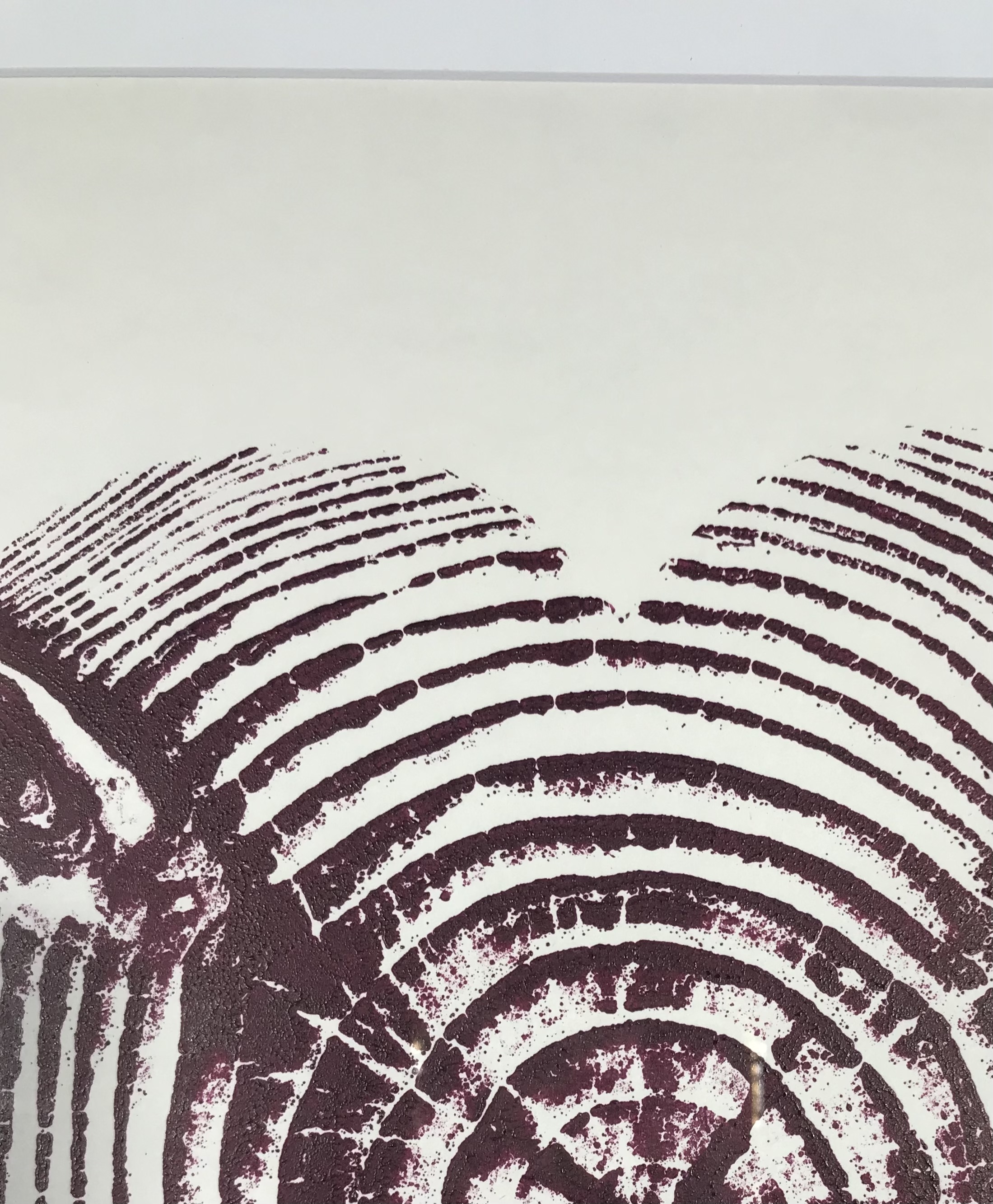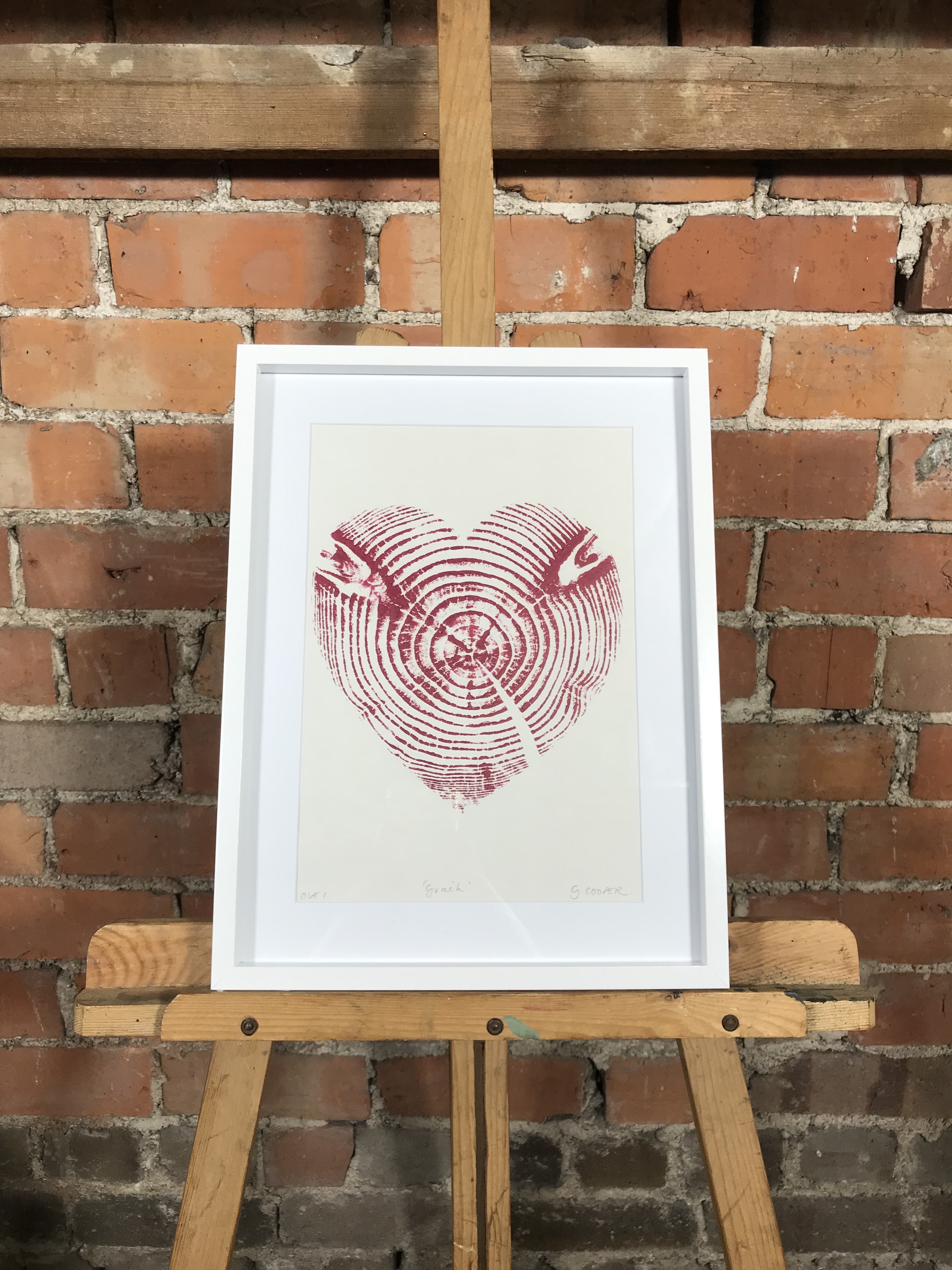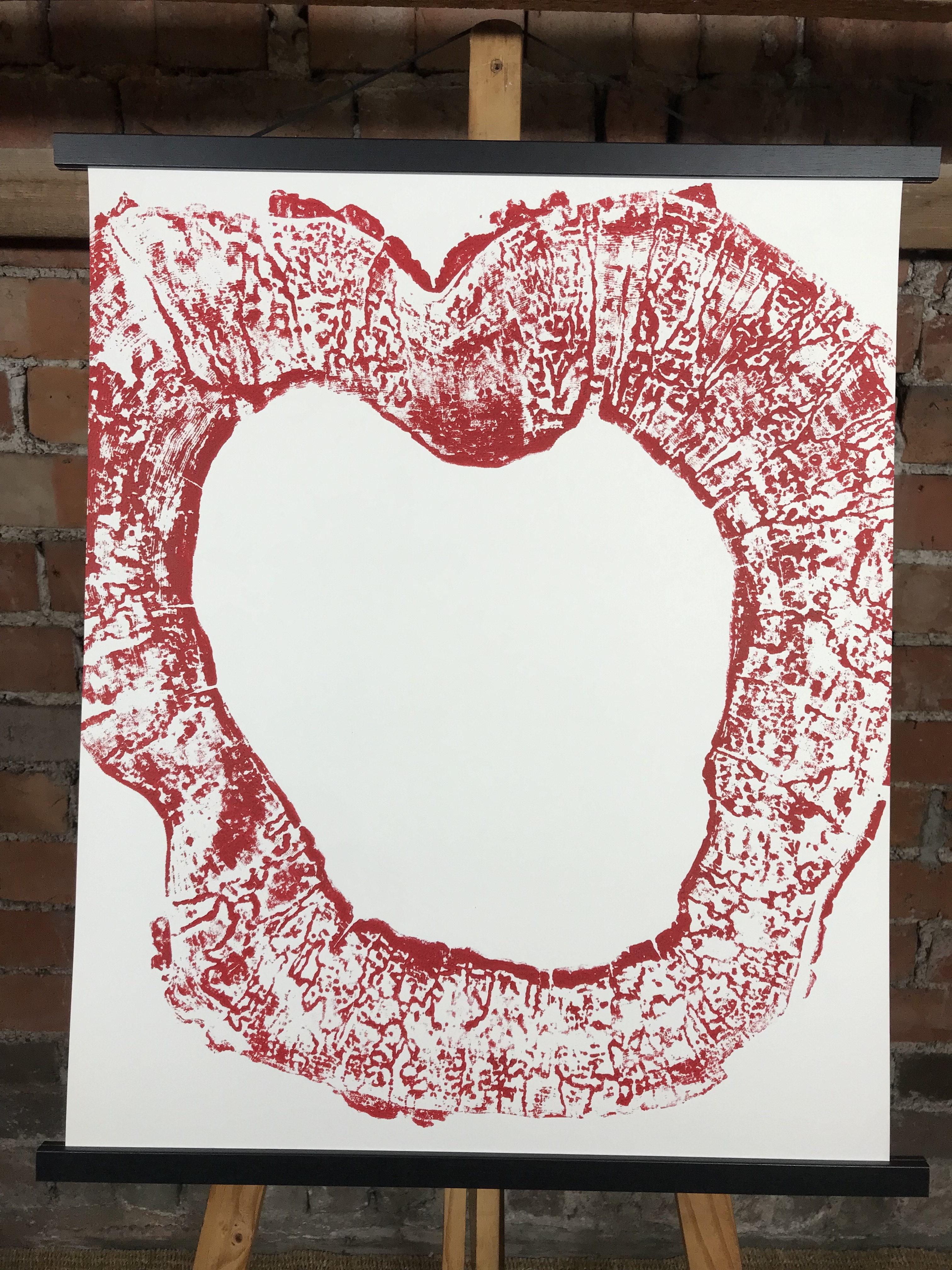 Original hand made spalted ash tree print in red. 52 x 65.5 cm £95 unframed/£115 with black wooden hanger as pictured