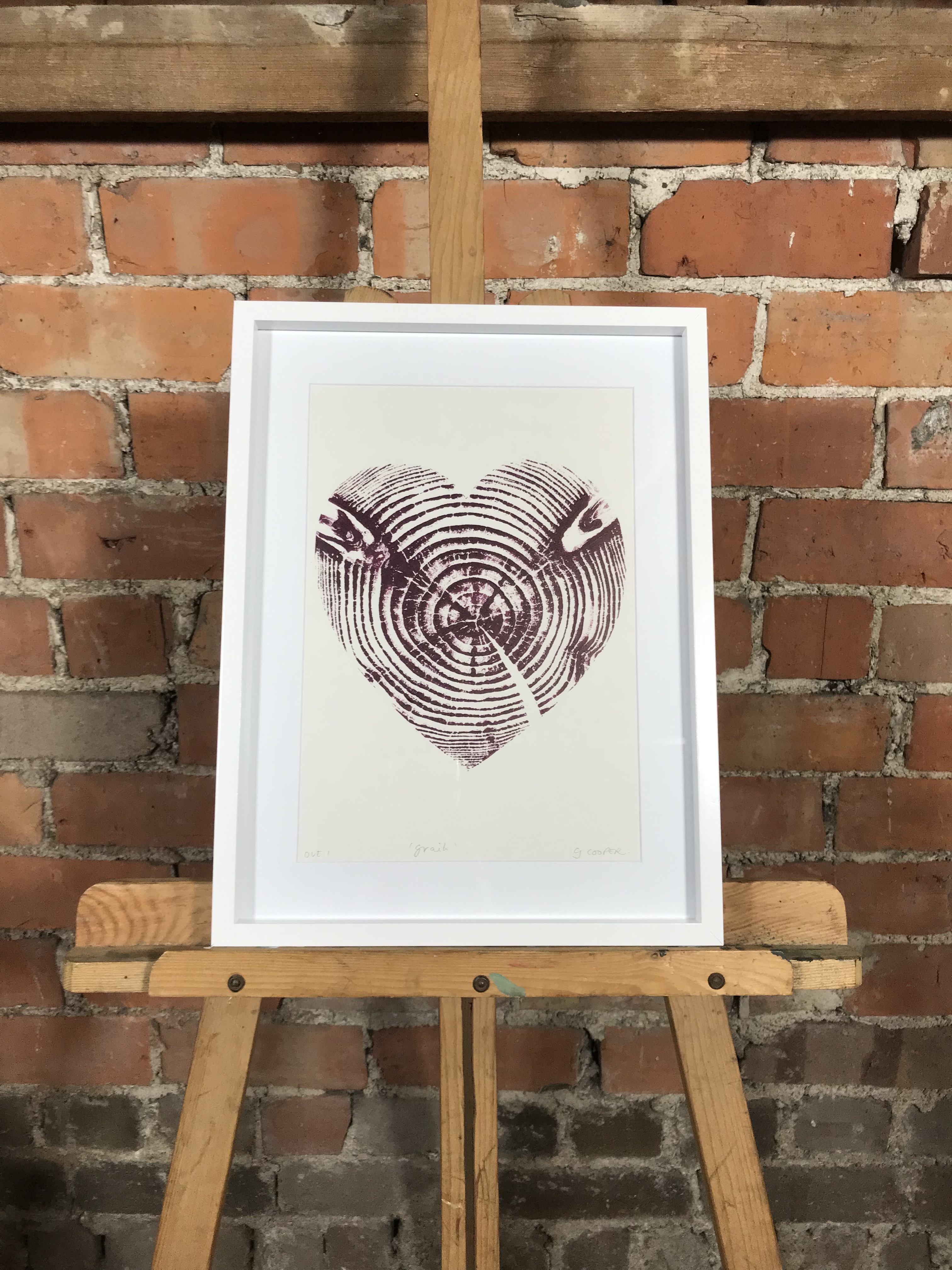 Love heart trio - 'graih' meaning 'love' in Manx, shown in fuchsia, magenta, and purple 30 x 40cm mounted original hand made spruce tree prints £32 each