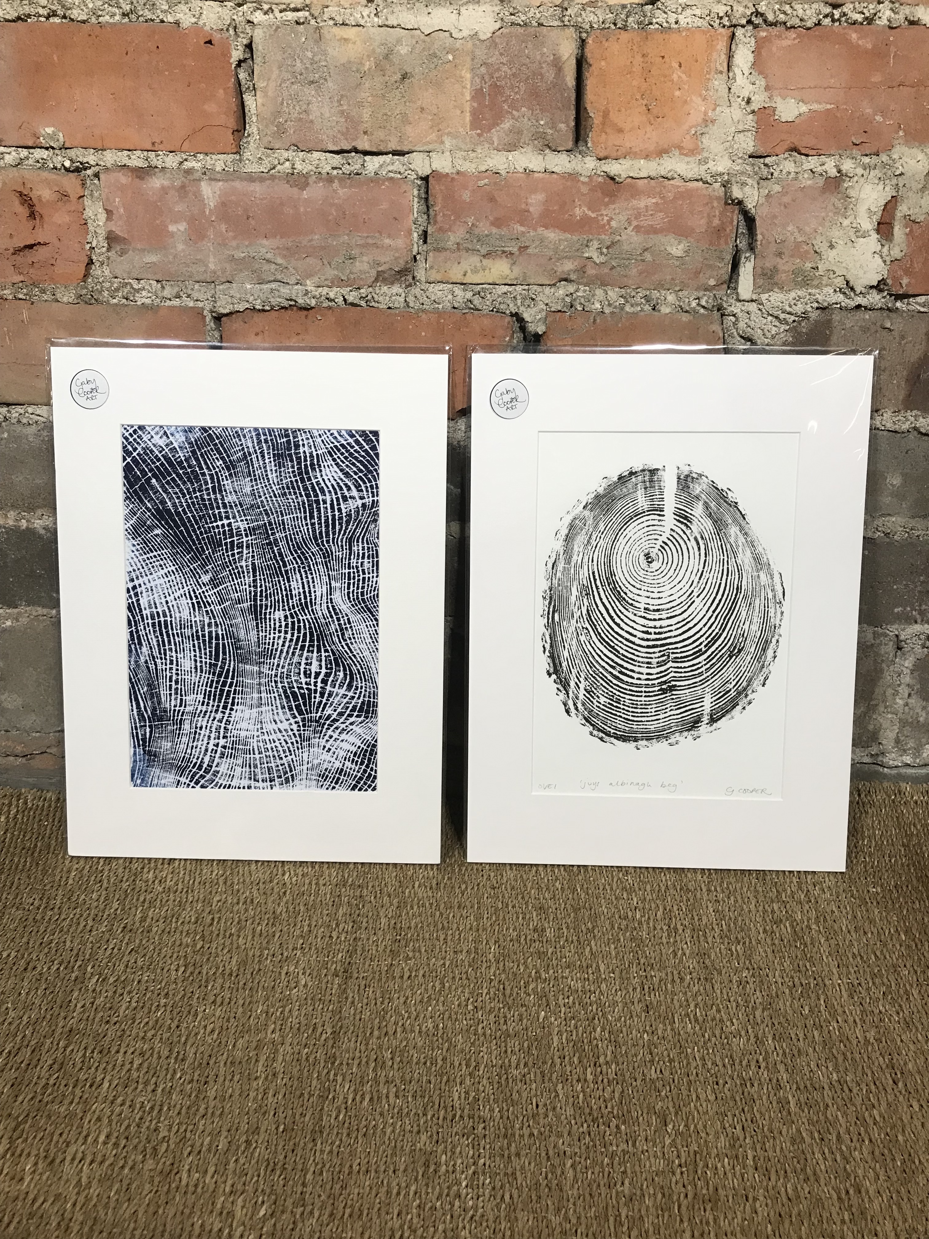 Tree print duo - original hand made tree prints. Elm and larch from the Isle of Man. 30 x 40cm £32 each